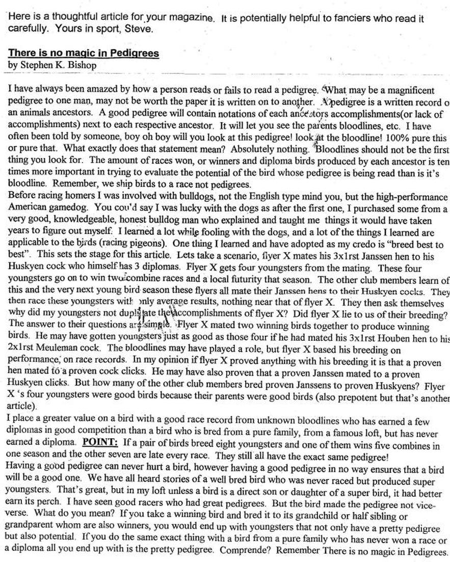 The objective here was to produce a dog as close to Triple Ott Red as possible without cloning (not an option back in 1983). Although Red Feather was a female, she would lift one leg up when urinating as male dogs do. She acted like a male dog. Now I might not race a bird bred like Red Feather, but I sure as hell would do this type of breeding, which I call “Triple Crossing” to preserve an old multi-diploma, proven prepotent producer. The same principle, but not as intense, could be used to produce a consistent family of winning birds. This is the route to increase consistency in a loft. Start with top notch birds and limit the gene pool. Now, to produce the world beating, set the combine on fire, ten times first, type of racer, you would probably have a greater chance outcrossing two diploma winning individuals from unrelated consistent families, but that’s another article. This write-up should give you an idea on how to take advantage of Filial Degeneration to establish a consistent prepotent line of racers.