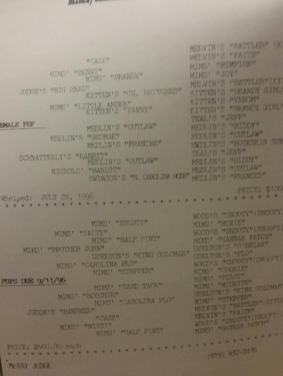 I have a BFKC pedigree back at the house that has her as double bred on Medlin's George. Way back when there was an ADBA registration that had her double bred out of Charlie. Or it may be flip flopped. I will look tomorrow. I remember them being different but I can't remember which way.