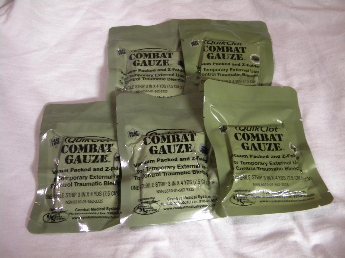 QuikClot Combat Gauze IFAK Quik Clot Z-Folded Vacuum Sealed Exp 2015. Vacuum Packed and Z-Folded. For temporary external use to control traumatic bleeding. NSN: 6510-01-562-3325 Combat Gauze is an advanced hemostatic agent combined with the simplicity of gauze. It is the first gauze to stop arterial and venous bleeding rapidly. Powerful, yet cool, so it won't burn, Combat Gauze is pliable to pack into even penetrating traumatic wounds. This product is flexible to cover any size or shape. Gauze is easy to use and easy to remove. It is so intuitive and greatly improves hemorrhage control in the most demanding tactical setting. X-Ray Strip so it's easily detectable. Weight & Dimensions: Unit Weight: .75oz Unit Dimensions Deployed: 144"L x 3"W Unit Dimensions Package: 6"H x 4.38"W x .25"D Unit Cube Package: .004 You are buying five QuickClot