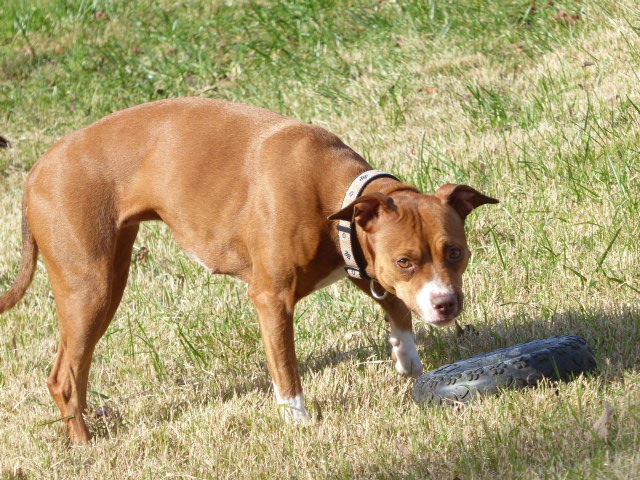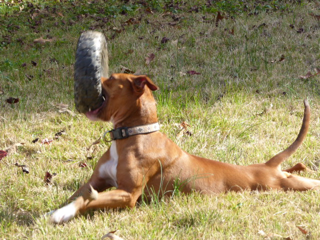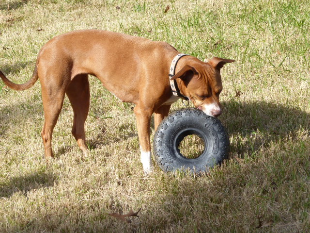 Gave my gyp a "Tire Biter" toy today and she had a fine time throwing it around the yard. Thought the board would enjoy some pics of a happy dog enjoying a new toy. My dogs over the yrs have had many durable toys but I never leave them alone with anything but a big raw beef knuckle bone.